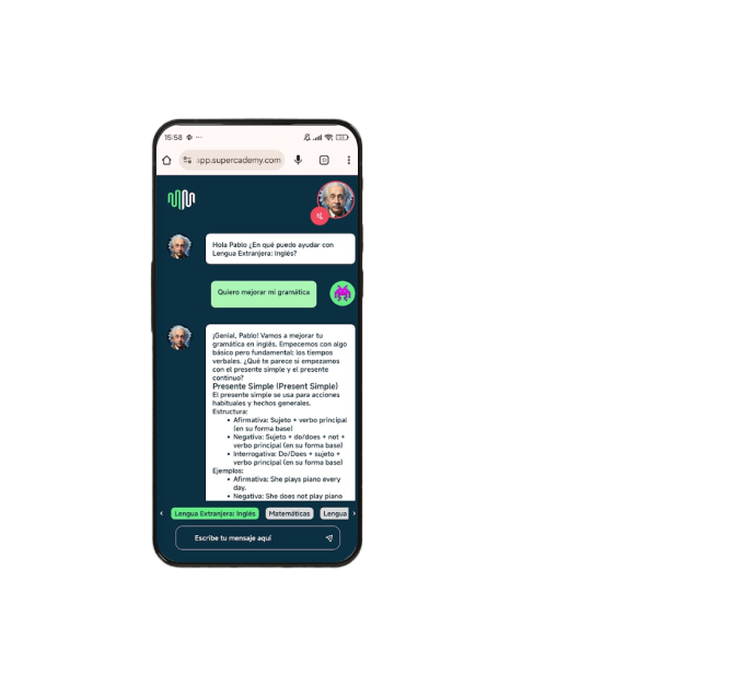 «Aprender inglés siempre ha sido un reto para mi hijo, Álvaro, pero con Supercademy ha mejorado notablemente. El hecho de poder practicar conversación en cualquier momento y recibir correcciones en tiempo real hace que su confianza aumente sin miedo a ser juzagado. Ahora se siente cómodo hablando en inglés, algo que nunca pensamos que lograría tan rápido.»